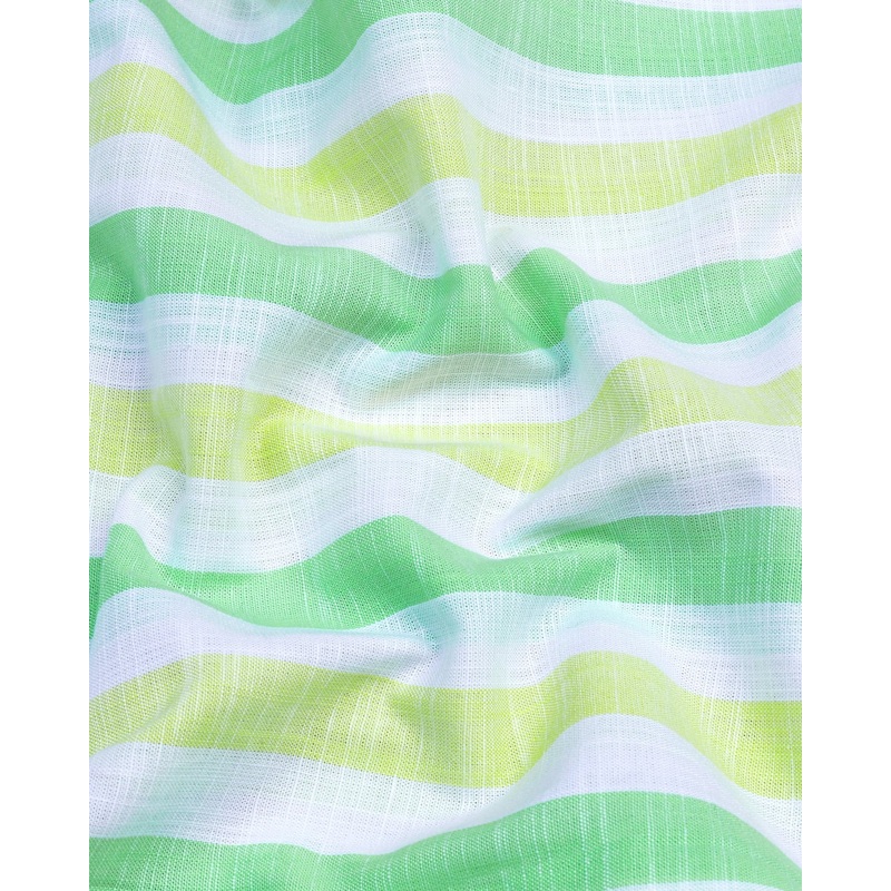 Light up your formal look with this Thelon Green With White Broad Stripe Linen Cotton Shirt. This shirt is the perfect alternative to your staple on your holiday professional meetings. It is easy to wear off-duty as well as business casual with a matching hamercop chinos. Designed for style and comfort, this Thelon Green With White Broad Stripe Linen Cotton Shirt from the hamercop will give you a sartorial edge. Made from the strongest fabric weave, this shirt features a regular collar, full sleeves and half sleeves, and stripes all over. Pair this with formal trousers for a perfect formal look!