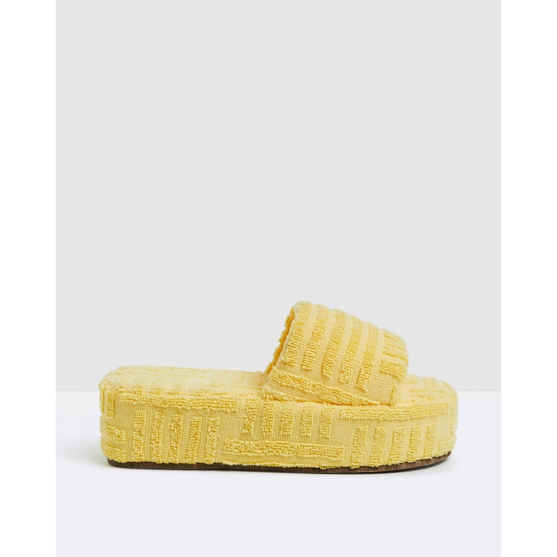 The Tori Terry Slides by Alice In The Eve come in a bright yellow colourway and feature a flatform sole. They are made from a soft towelling fabrication and are designed with a round toe.