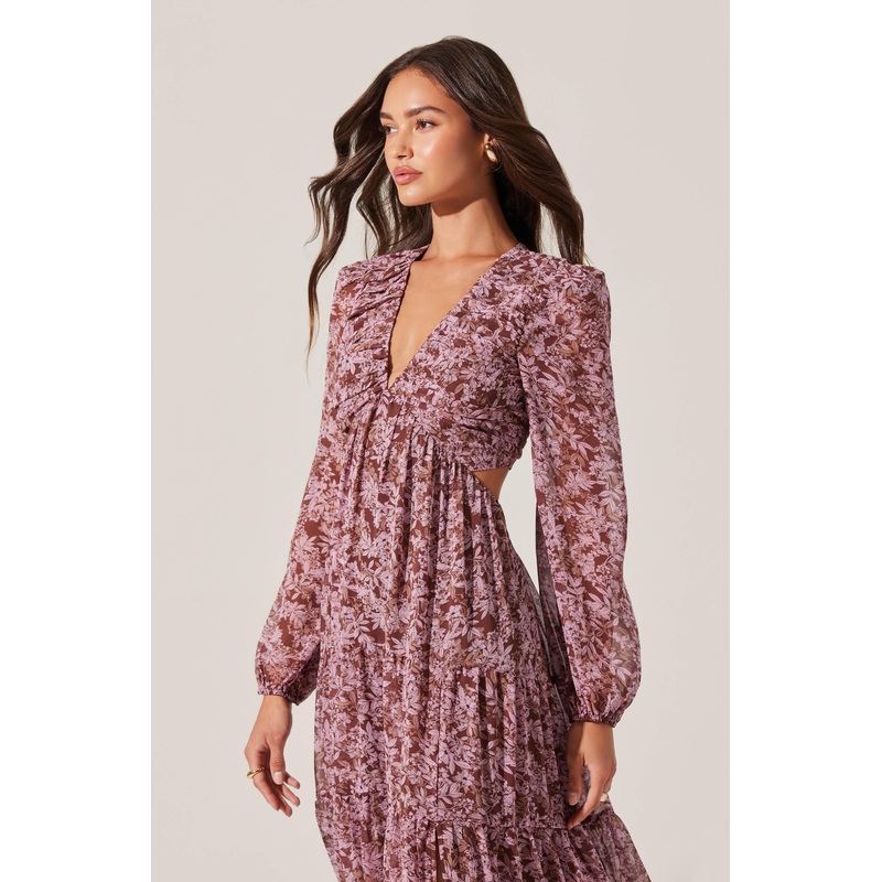 V-Neck Cutout Midi Dress Brown pink floral