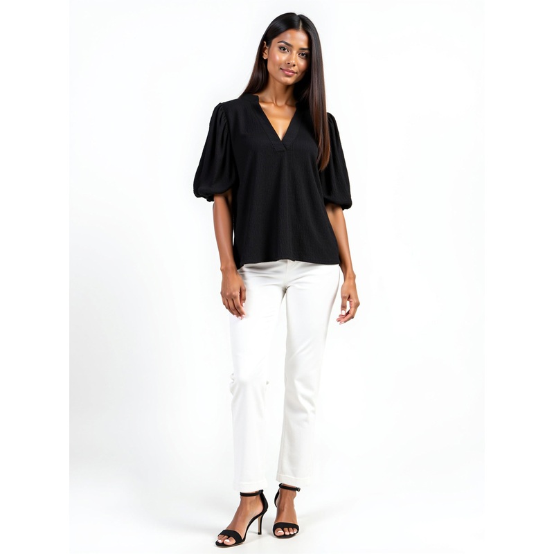 The V Neck Puff Sleeve Top brings a touch of drama to your wardrobe. Featuring voluminous sleeves and a flattering neckline, it’s an instant statement piece. Dress it down with jeans or up with a midi skirt.