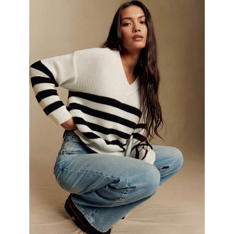 Classic yet modern, this v-neck stripe sweater offers a flattering neckline and effortless styling. Featuring bold horizontal stripes and a relaxed fit, it pairs perfectly with jeans, skirts, or tailored trousers. The soft knit fabric ensures comfort, while the timeless design makes it a wardrobe staple. Dress it up with a blazer or keep it casualthis sweater is endlessly versatile.