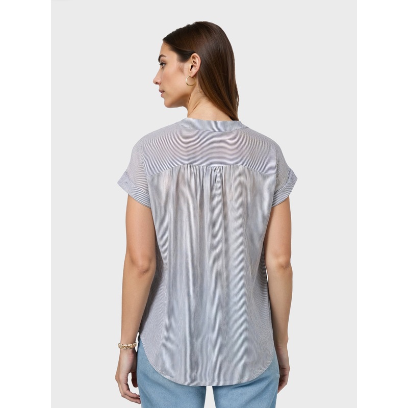 Smart and breathable, the V Neck Striped Blouse is a polished staple for warm weather. With crisp stripes and a clean V-neckline, it offers a tailored yet relaxed vibe. The lightweight fabric ensures all-day comfort, whether youre in meetings or at brunch. Tuck it into high-rise trousers or wear it loose with denim.