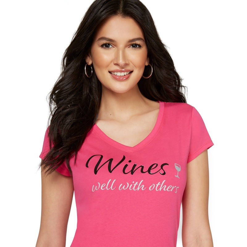 This playful graphic tee features a scoopneck, short sleeves and a graphic print that says it all: ‘Wines Well With Others.’