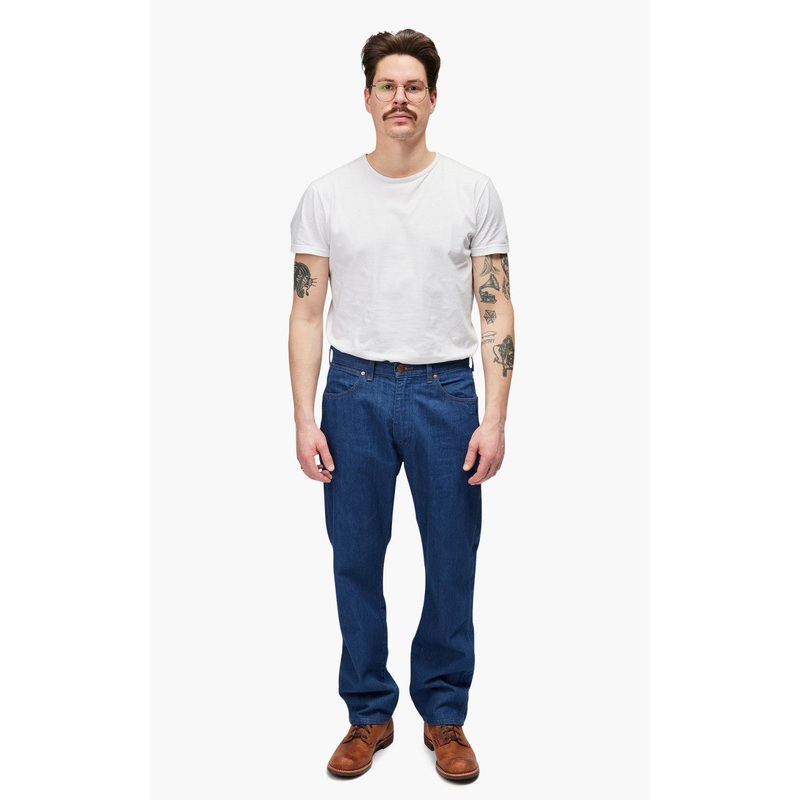 The authentic Frontier jean features a comfortable, mid-rise waist, relaxed thigh and straight leg. Itis for those who value looking good and feeling ultra-comfortable in equal measure. With the medium-high waistband and straight leg, they always sit perfectly. Crafted from blue non-stretch Wrangler denim.