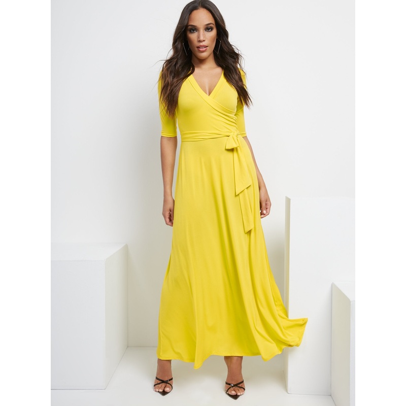 Bright on! A sunny yellow hue enlivens our must-have maxi dress, enhanced by a flattering v-shaped neckline, graceful wrap silhouette and waist-defining self-tie belt.