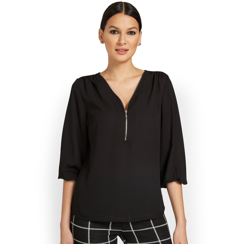 Zip-Front Blouse – Plaid BLACK – BLACK