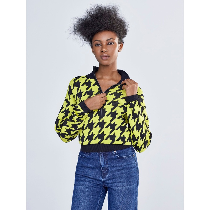 Zip-Front Houndstooth Pullover Sweater GREEN – CITRUS BREEZE