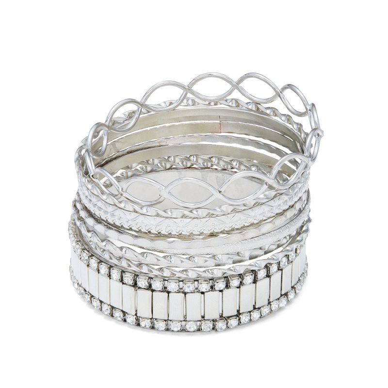 11-Piece Silver-Tone Mixed Metal & Rhinestone Bracelets Set GREY – SILVER